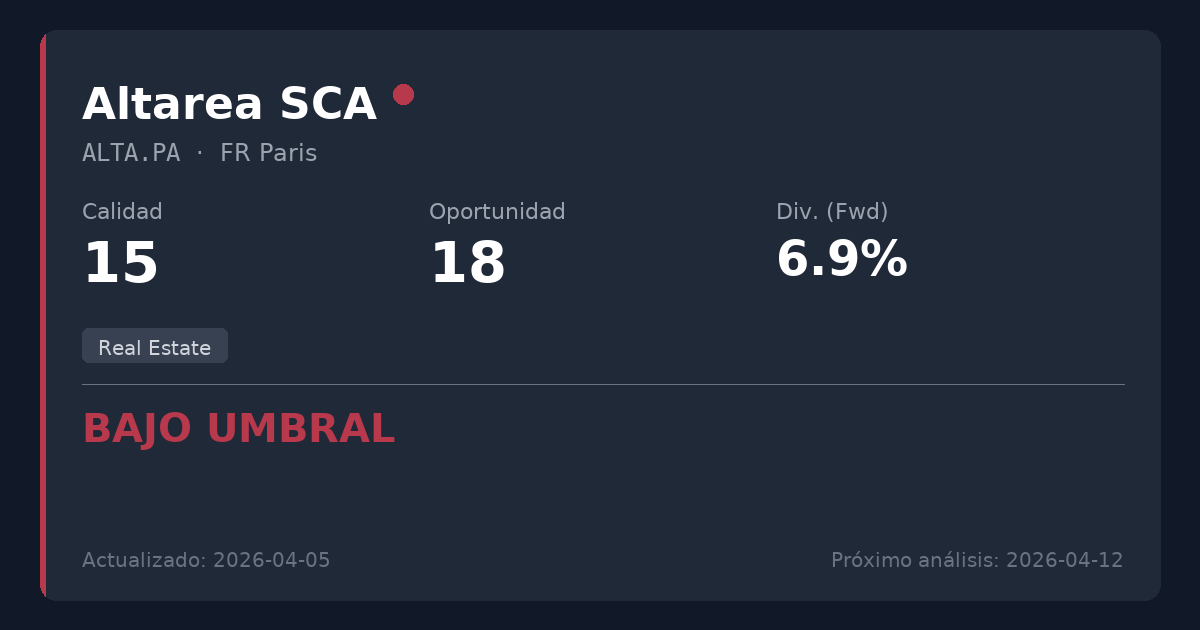 Altarea SCA es un promotor inmobiliario francés que actualmente se enfrenta a graves vientos en contra estructurales en el mercado de la vivienda residencial. La combinación de niveles de deuda peligrosos (12,39x Deuda Neta/EBITDA), una cobertura de flujo de caja libre negativa y un historial de recortes crónicos de dividendos hace que esta acción sea totalmente inadecuada para estrategias de renta conservadoras. No recomendada para nuevas posiciones, ya que los ratios de Payout extremos y el deterioro fundamental indican que la rentabilidad del 6,96% es una trampa de valor en lugar de una oportunidad sostenible.