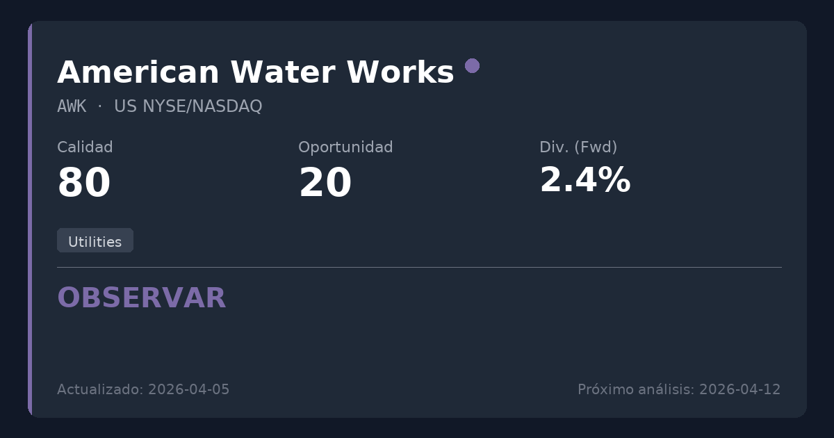American Water Works es una empresa de servicios públicos (utilities) de agua regulada de primer nivel que opera como un monopolio puro en el sector de servicios esenciales por excelencia. Aunque la empresa cuenta con una fosa económica excepcional y un historial impecable de crecimiento de dividendos, la valoración premium actual (PER de 24,2) y una rentabilidad por dividendo inferior al 3% ofrecen un potencial limitado al alza. Los accionistas actuales deberían mantener sus posiciones dada la excelente calidad del negocio, pero los nuevos inversores quizás quieran esperar un mejor punto de entrada con un mayor margen de seguridad.