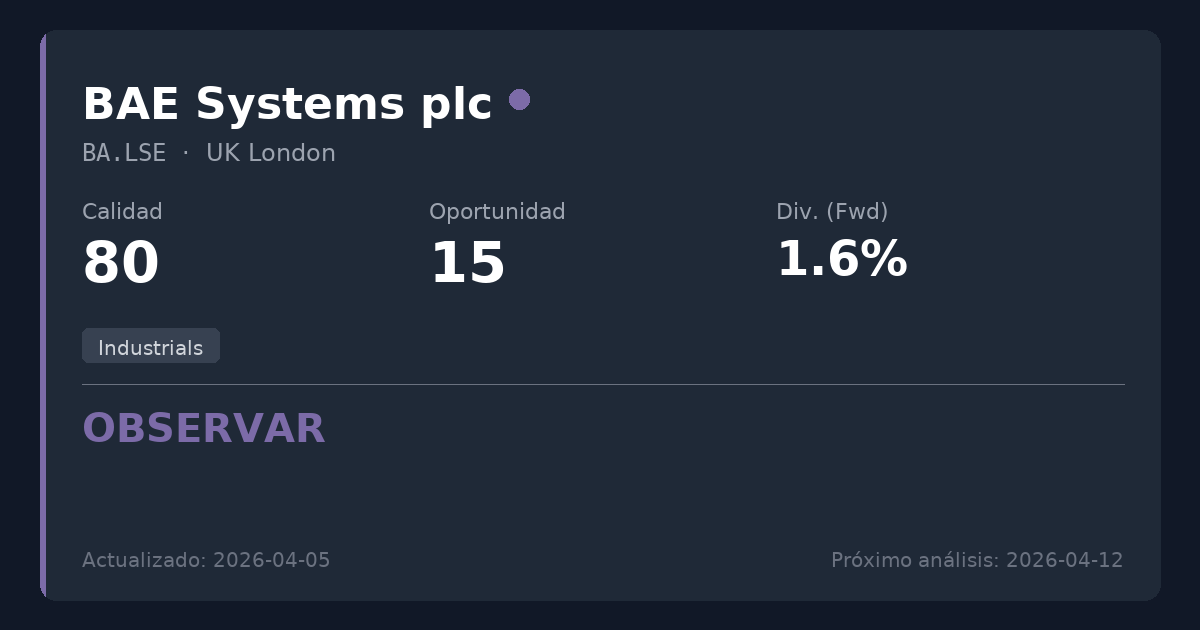 BAE Systems opera en el sector industrial, concretamente como contratista líder global en aeroespacial, defensa y seguridad. Aunque no es un servicio público de consumo tradicional, los grandes contratistas de defensa suelen operar como cuasi-monopolios con enormes barreras de entrada y contratos gubernamentales fiables y a largo plazo, lo que hace que sus flujos de caja subyacentes sean altamente predecibles y muy adecuados para el crecimiento de dividendos a largo plazo.