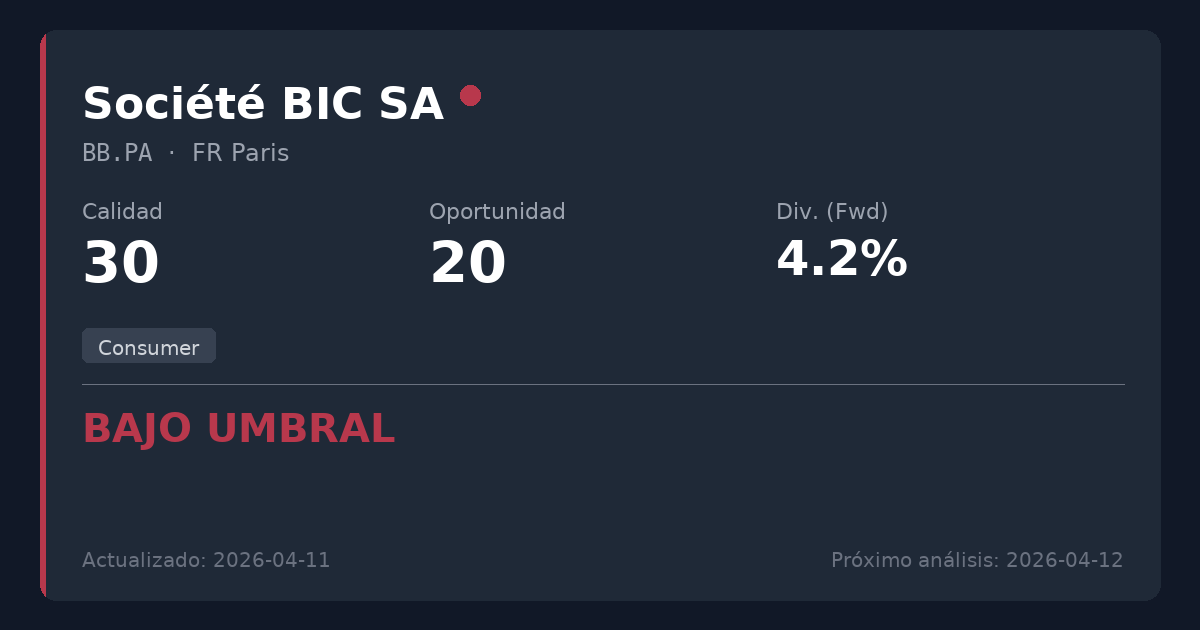 Société BIC es un fabricante global de bienes de consumo conocido por artículos cotidianos como bolígrafos, mecheros y maquinillas de afeitar. A pesar de un fuerte reconocimiento de marca y un balance sólido, los recortes crónicos de dividendos y los beneficios estructuralmente decrecientes hacen de la empresa un generador de ingresos poco fiable. No se recomienda para nuevas posiciones dadas las persistentes dificultades fundamentales, los márgenes en contracción y el historial reciente de reducciones recurrentes de dividendos, lo que la sitúa firmemente en el cuadrante BAJO UMBRAL.