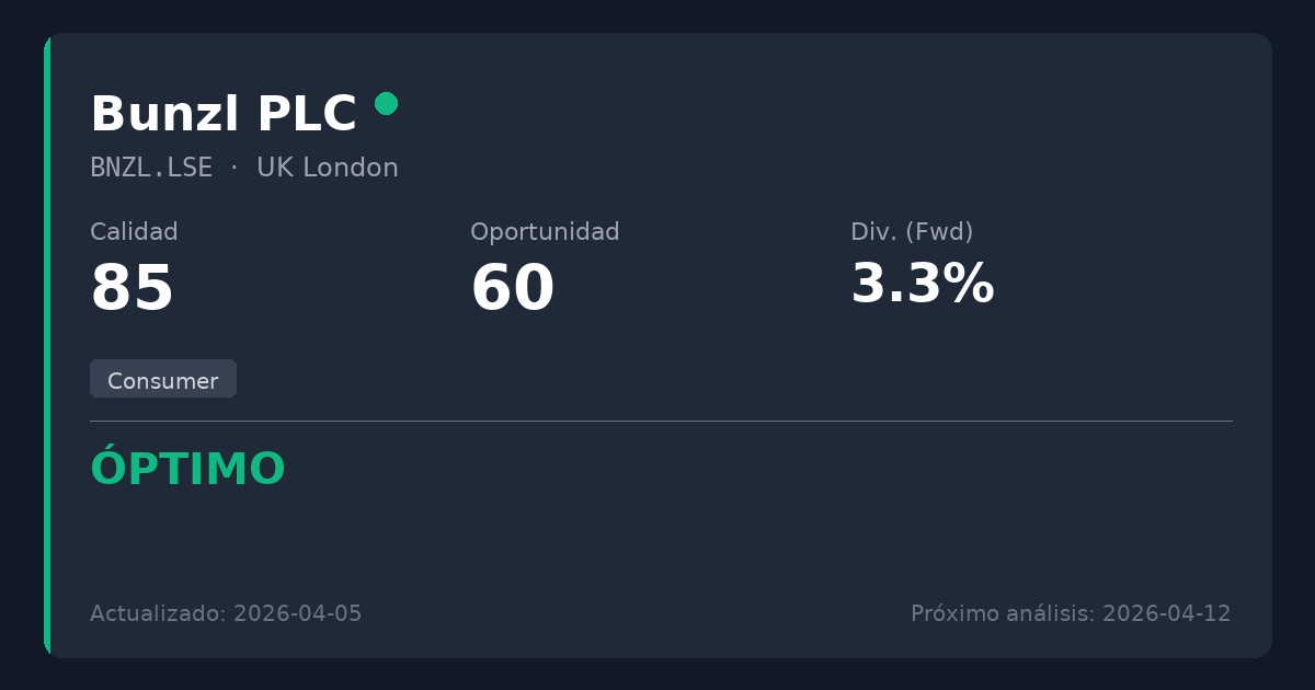 Bunzl es un distribuidor global de alta calidad de consumibles B2B esenciales con un historial excepcional de fiabilidad de dividendos y generación masiva de flujo de caja libre. La reciente y cautelosa previsión de márgenes para 2026 y la posterior reacción del mercado presentan un revés temporal clásico para un capitalizador defensivo probado. Cotizando a 2254 GBX, por debajo de nuestra estimación de valor razonable monopolístico de 2535 GBX, esto representa un punto de entrada atractivo para inversores en dividendos que buscan estabilidad a largo plazo y crecimiento sostenible de los ingresos.