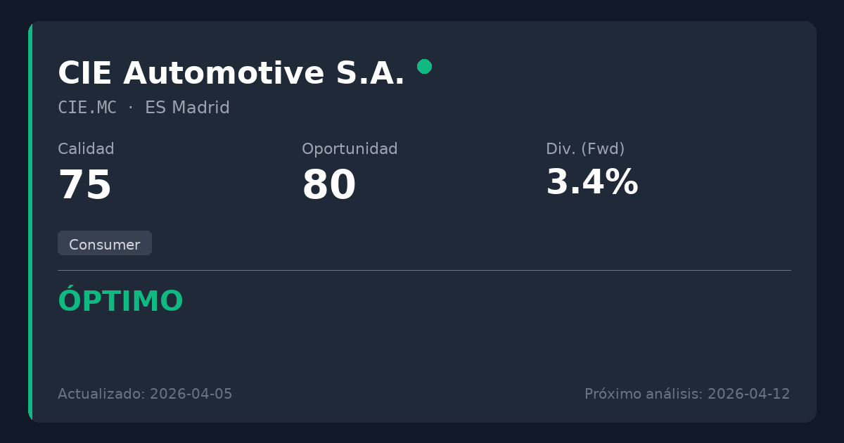 CIE Automotive es un proveedor global de componentes y subconjuntos de automoción, que genera ingresos mediante el diseño y fabricación de piezas para fabricantes de vehículos a nivel mundial. Aunque el sector de la automoción es inherentemente cíclico y sensible al gasto discrecional del consumidor, CIE mitiga estos riesgos a través de una alta eficiencia operativa, una exposición geográfica diversa y una asignación de capital disciplinada, lo que la hace inusualmente resiliente para un negocio cíclico de consumo.