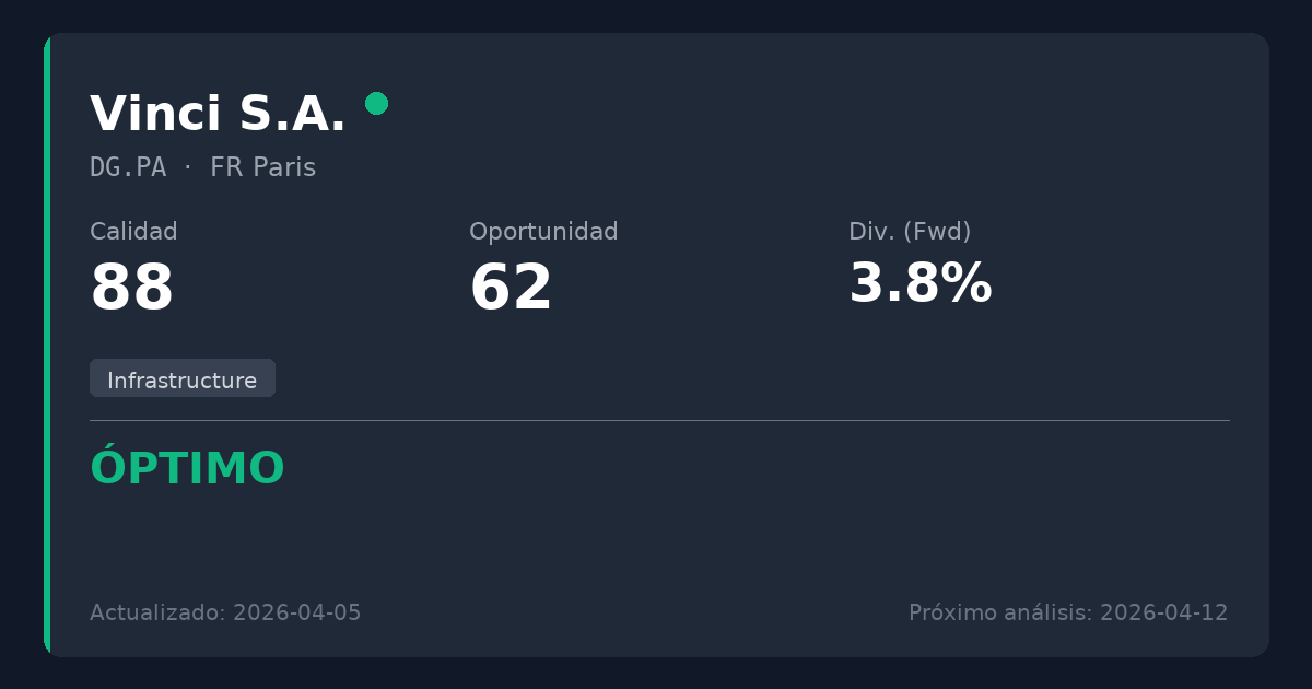 Vinci es un líder global de infraestructuras de alta calidad con un dividendo muy seguro, respaldado por activos monopolísticos de autopistas de peaje y aeropuertos. Cotizando a 131,60 € (PER 15,2), la acción se sitúa cómodamente por debajo de nuestra estimación de valor razonable monopolístico de hasta 155,64 €, lo que representa aproximadamente un 18% de potencial alcista respecto al valor razonable. La rentabilidad por dividendo del 3,77% está excepcionalmente bien cubierta por el flujo de caja libre, lo que la hace digna de consideración para nuevas posiciones como una participación central en infraestructuras.