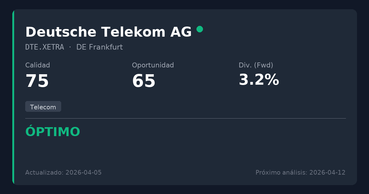 Deutsche Telekom es el proveedor de telecomunicaciones dominante en Europa, ofreciendo servicios esenciales de infraestructura como soluciones móviles, de banda ancha y TI empresariales, y obteniendo un crecimiento significativo de su participación mayoritaria en T-Mobile US. En el sector de telecomunicaciones, intensivo en capital, su ratio Deuda Neta/EBITDA de 2.63x está holgadamente dentro de límites seguros y demuestra un desapalancamiento exitoso, mientras que su masiva generación de caja soporta fácilmente tanto las inversiones en infraestructura como las retribuciones a los accionistas.