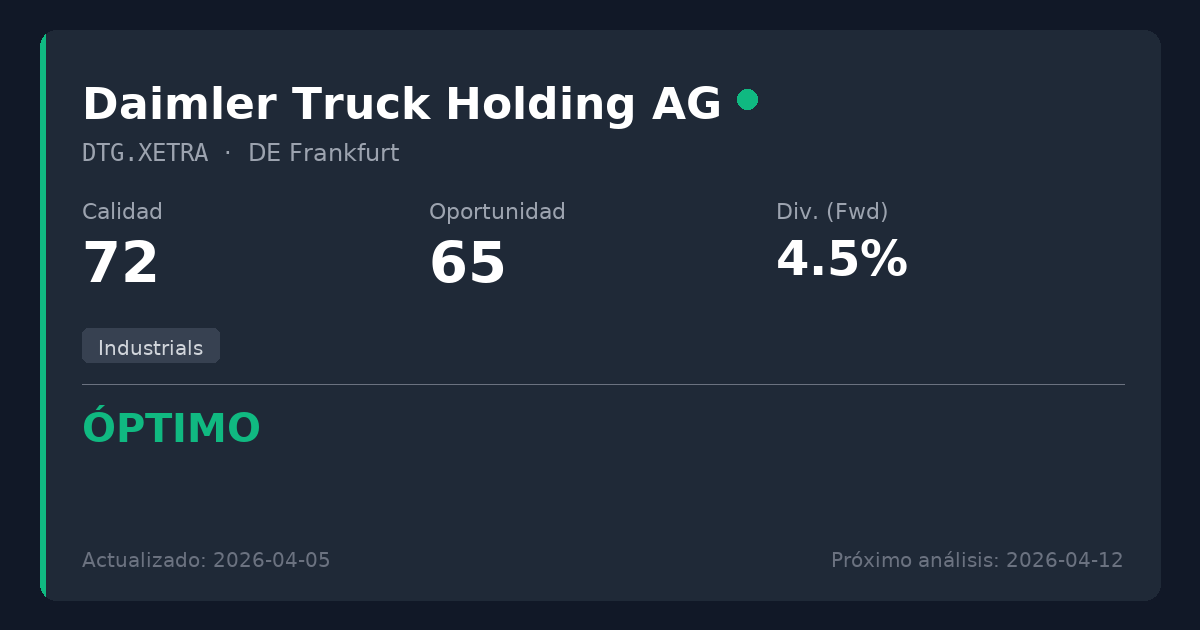 Daimler Truck Holding AG es el mayor fabricante mundial de vehículos comerciales, produciendo camiones y autobuses bajo marcas como Mercedes-Benz y Freightliner, al tiempo que ofrece financiación de flotas y servicios posventa. Para los inversores en dividendos, aunque la fabricación industrial es intrínsecamente cíclica, el transporte de mercancías por carretera forma la columna vertebral esencial de la logística global, proporcionando visibilidad de la demanda a largo plazo y una generación fiable de flujo de caja necesaria para respaldar dividendos sostenibles.