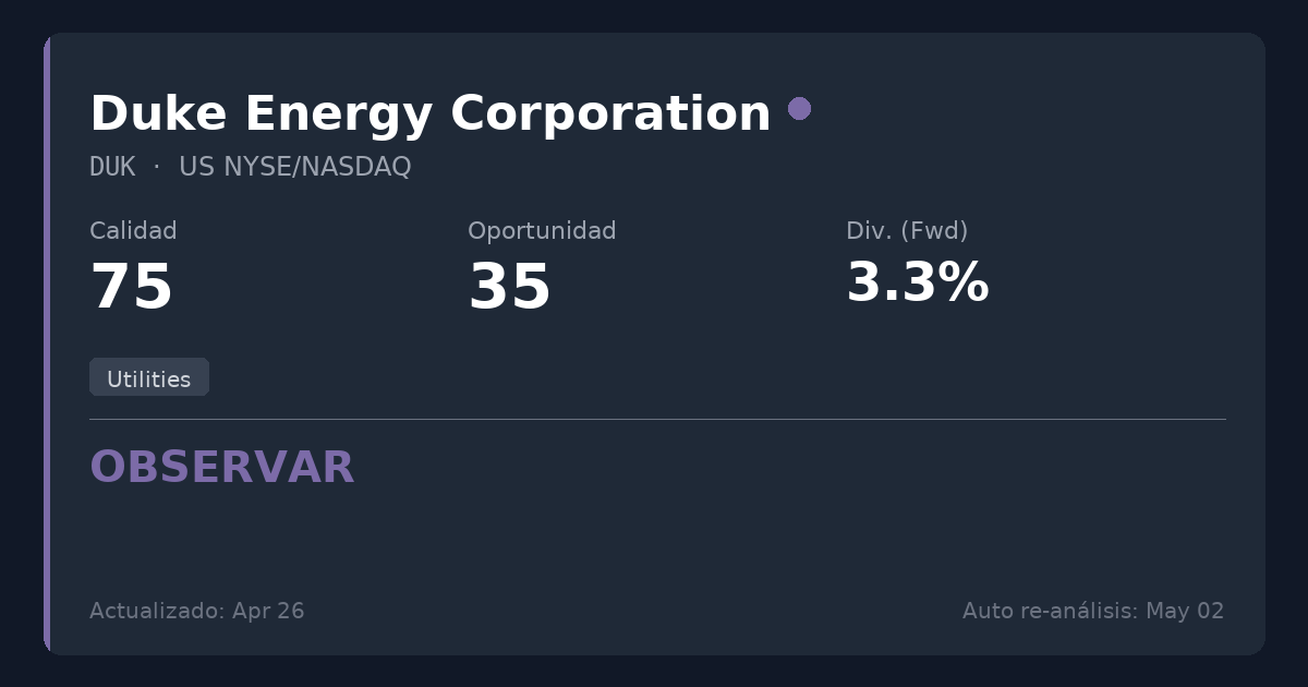Duke Energy es una destacada empresa de servicios públicos regulada que opera como un monopolio regional, con flujos de caja altamente predecibles y un historial de dividendos fiable. Aunque el negocio subyacente sigue siendo excepcionalmente sólido, con masivas inversiones de capital planeadas para satisfacer la creciente demanda de energía, la valoración actual, cercana a 20 veces los beneficios, ofrece un potencial alcista limitado. Los accionistas actuales deberían mantener sus posiciones dada la segura Rentabilidad por Dividendo del 3,3% y las sólidas métricas P/FFO, pero los nuevos inversores quizás quieran OBSERVAR la acción para un punto de entrada más atractivo.