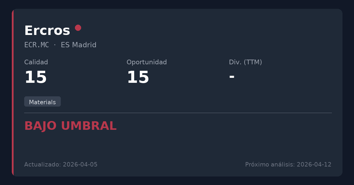 Ercros es un fabricante químico español que produce productos químicos básicos, plásticos y farmacéuticos. El sector químico básico es altamente cíclico y vulnerable a la fluctuación de los costes energéticos y a los precios globales de las materias primas, lo que lo hace generalmente inadecuado para estrategias conservadoras de dividendos que requieren flujos de caja estables y predecibles.