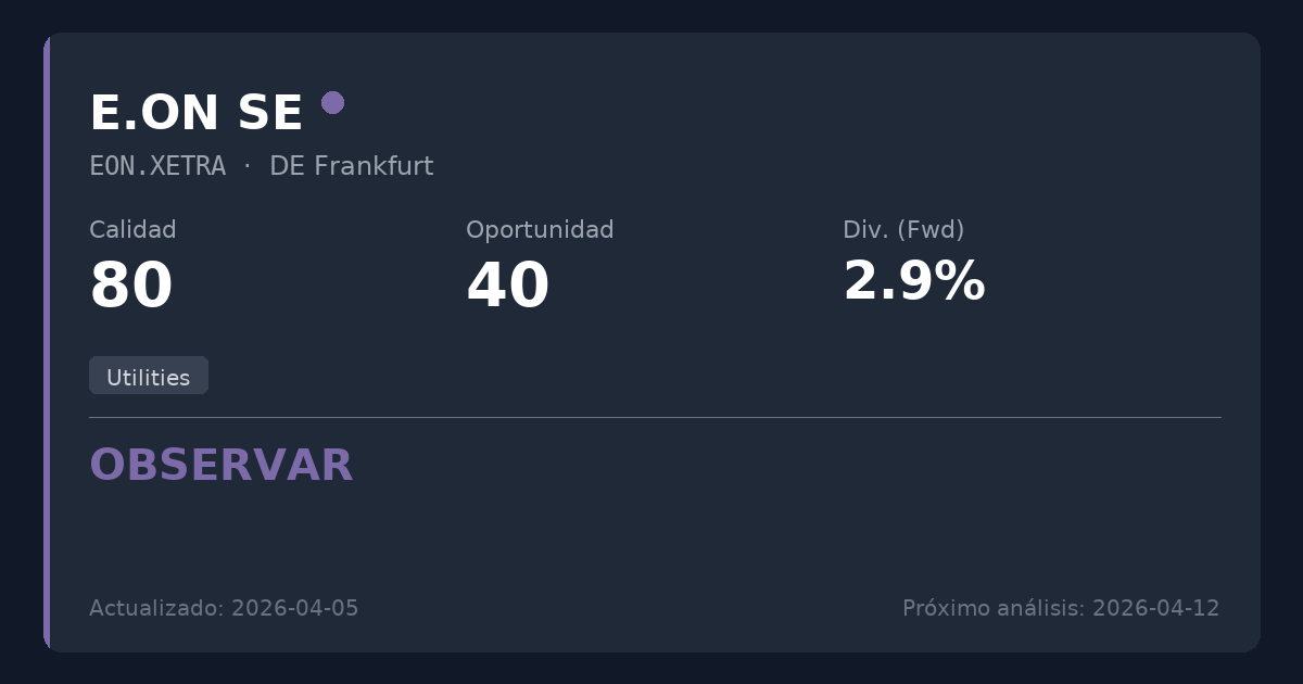 E.ON es un operador europeo líder de redes energéticas e infraestructura energética, que proporciona servicios esenciales de distribución de electricidad y gas. Como empresa de Servicios Públicos (Utilities) regulada, disfruta de características de monopolio y flujos de caja predecibles, lo que, por lo general, permite a la empresa soportar de forma segura mayores niveles de deuda (como su actual Deuda Neta/EBITDA de 3,94x) para financiar expansiones de red necesarias y a largo plazo.