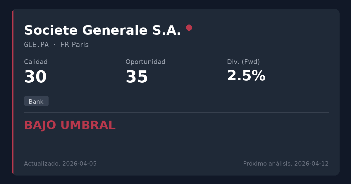 Societe Generale es un importante banco universal europeo actualmente lidiando con la compresión de márgenes y una reestructuración estratégica. Si bien la acción cotiza a un PER aparentemente barato de 9,44, su historial crónico de severos recortes de dividendos, un ROE deficiente y una rentabilidad por dividendo inferior al 2,5% lo hacen estructuralmente inadecuado para una cartera de ingresos conservadora. Existen mejores oportunidades en instituciones financieras más estables con una fiabilidad de dividendos demostrada.