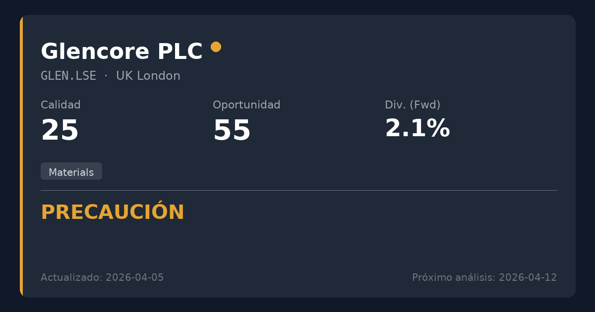 Glencore es una importante empresa global de comercio de materias primas y minería que actualmente atraviesa una grave recesión cíclica y deterioros operativos. Aunque la valoración a futuro sugiere un posible suelo cíclico, la exposición pura de la compañía a las materias primas, sus beneficios volátiles y los recortes recurrentes de dividendos la hacen fundamentalmente inadecuada para estrategias de dividendos conservadoras. No recomendada para nuevas posiciones, ya que existen mejores oportunidades de ingresos en sectores de servicios esenciales más estables.