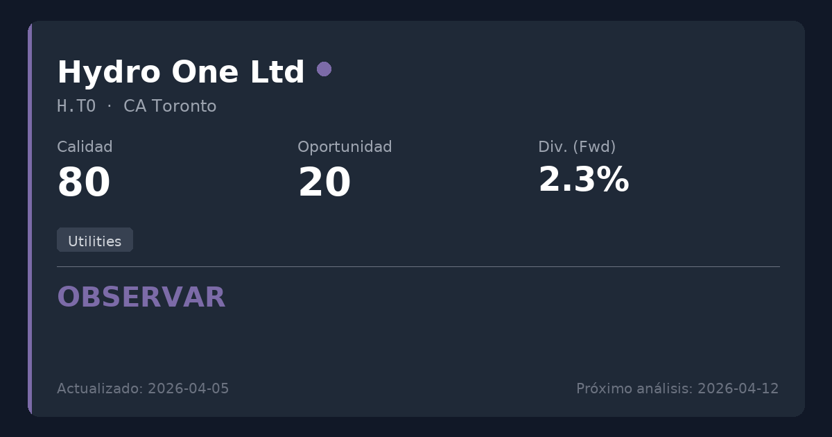 Hydro One es una destacada empresa de Servicios Públicos (Utilities) canadiense que opera como un monopolio natural regulado sobre la red eléctrica de Ontario, lo que le confiere una estabilidad a largo plazo y una visibilidad de beneficios excepcionales. Si bien la calidad subyacente del negocio es sobresaliente y las recientes transiciones en la dirección parecen ordenadas, la valoración actual, que es elevada (PER 26), y su baja rentabilidad por dividendo (2,27%) ofrecen un potencial alcista limitado. Los accionistas actuales deberían mantener sus posiciones dada la inmensa ventaja competitiva, pero los nuevos inversores podrían querer esperar una corrección significativa más cerca de los múltiplos históricos de las empresas de Servicios Públicos (Utilities) antes de iniciar posiciones.