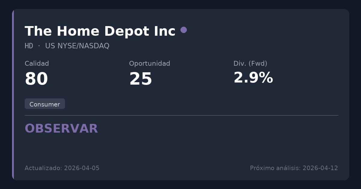 The Home Depot es el minorista de mejoras para el hogar más grande del mundo, operando un duopolio dominante en el sector de consumo junto a Lowe's. Si bien el comercio minorista es generalmente cíclico, el sector de mejoras para el hogar presenta características cuasi esenciales debido a las necesidades continuas de mantenimiento de propiedades, aunque los proyectos discrecionales de gran importe permanecen sensibles a la dinámica del mercado inmobiliario y a los entornos de tipos de interés.