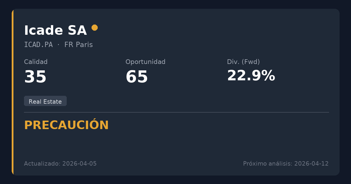Icade SA es una importante promotora e inversora inmobiliaria francesa que cotiza actualmente a valoraciones profundamente deprimidas. Aunque el masivo descuento sobre el valor contable (0,39x) ofrece un potencial significativo de recuperación cíclica, la rentabilidad del 22,85% es una señal de alarma no respaldada por el Flujo de Caja Libre, y la compañía tiene un historial reciente de recortes de dividendos. No se recomienda para nuevas posiciones conservadoras de dividendos dado el flujo de ingresos impredecible, aunque los inversores de valor profundo podrían OBSERVAR el entorno macroeconómico en busca de signos de estabilización del sector inmobiliario.