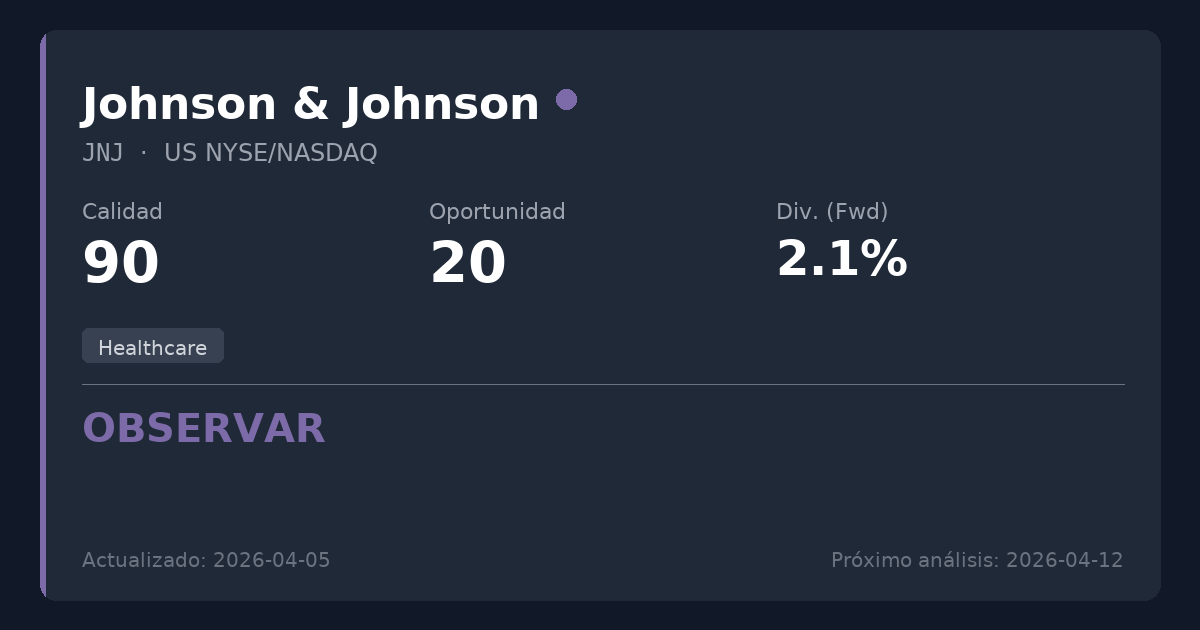 Johnson & Johnson es un líder mundial destacado en el sector de la salud con una excepcional estabilidad financiera, un balance de gran solidez y una larga trayectoria de dividendos seguros y crecientes. Si bien la calidad fundamental del negocio es sobresaliente, la cotización actual en torno a los 243 $ (PER 22,0) y una baja rentabilidad por dividendo del 2,11% ofrecen un potencial alcista limitado para nuevo capital. Los accionistas actuales deberían mantener sus posiciones dada la solidez de los fundamentales, pero los nuevos inversores podrían considerar esperar un mejor punto de entrada.