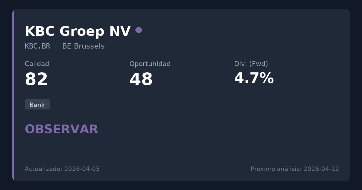KBC Groep es un proveedor líder europeo de banca-seguros con un modelo altamente rentable, un posicionamiento dominante en el mercado y un excelente ROE del 13,6%. Aunque la Rentabilidad por Dividendo del 4,6% es muy segura y está respaldada por un Payout conservador del 47%, la valoración actual en torno a los 108 € (PER 12) representa una prima respecto a sus homólogos regionales y ofrece un potencial de revalorización limitado. Los accionistas actuales deberían mantener sus posiciones dados sus sólidos fundamentales, pero los nuevos inversores podrían querer esperar un punto de entrada más atractivo.