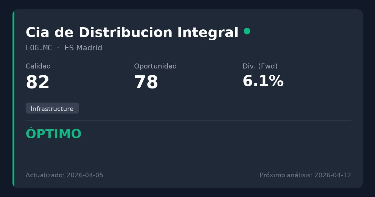 Logista es un operador líder de infraestructura y distribución en el sur de Europa, que gestiona la compleja cadena de suministro de tabaco, productos farmacéuticos y bienes de conveniencia. En el contexto de la inversión por dividendo, su modelo de negocio opera naturalmente con márgenes ajustados (margen EBITDA del 3,77%), pero genera volúmenes masivos y predecibles y un sólido Flujo de Caja Libre, convirtiéndolo en un excelente vehículo para ingresos por dividendos sostenibles.