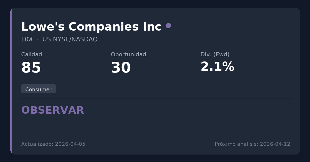 Lowe's es un minorista dominante de mejoras para el hogar que opera en un duopolio altamente rentable, con una amplia ventaja competitiva y un balance impoluto. Aunque la calidad del negocio subyacente es excepcional, con un fuerte crecimiento de dividendos y una sólida cobertura de flujo de caja, la valoración actual a un PER de 19,4 y una rentabilidad por dividendo del 2,01% ofrece un potencial alcista limitado. Los accionistas actuales deberían mantener sus posiciones, pero los nuevos inversores quizás prefieran esperar un mejor punto de entrada.