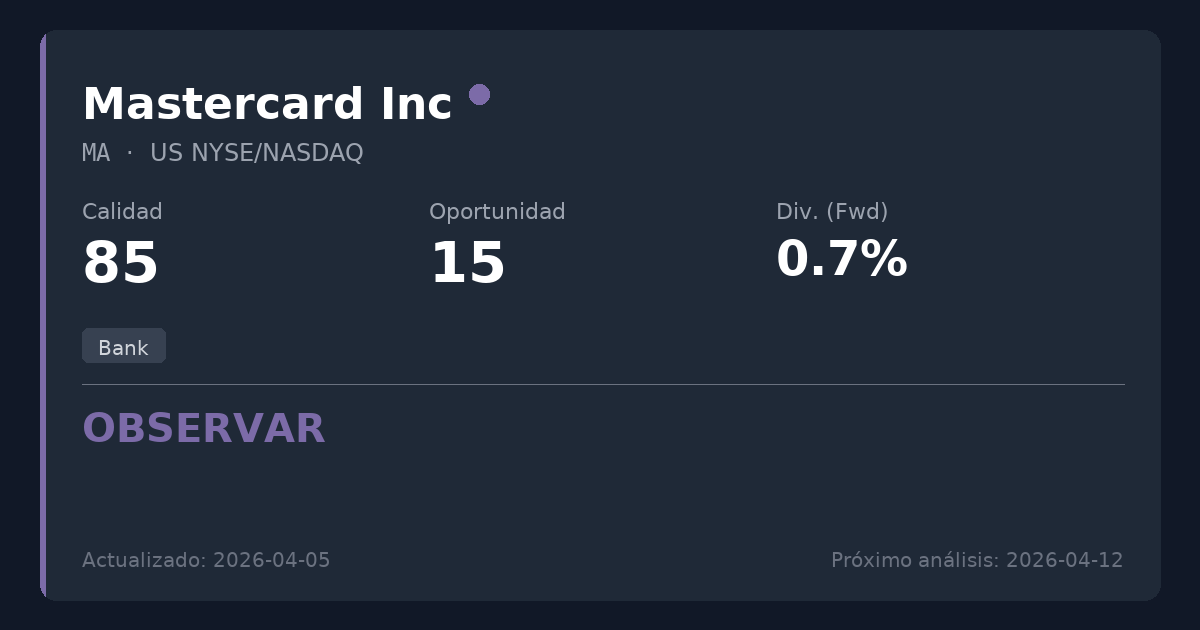 Mastercard opera una red global de procesamiento de pagos, actuando como una autopista digital esencial que conecta a consumidores, comercios e instituciones financieras. Aunque clasificada dentro del sector bancario, opera sin el riesgo de crédito tradicional de los préstamos comerciales, generando, en cambio, ingresos por comisiones altamente predecibles y con un modelo de activos ligeros, derivados de los volúmenes de transacciones globales.