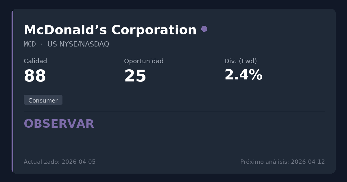 McDonald's opera en el sector de consumo como una red global de restaurantes de servicio rápido, funcionando principalmente como un negocio inmobiliario y de franquicias de alta rentabilidad. Para los inversores en dividendos, este modelo con gran peso en franquicias proporciona una estabilidad en el flujo de caja similar a la de los Servicios Públicos (Utilities), a través de cobros predecibles de alquileres y cánones, lo que protege a la empresa de presiones directas sobre el margen operativo de los restaurantes.