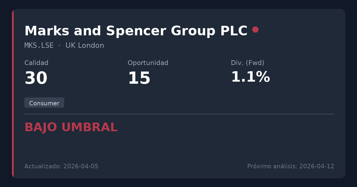 Marks and Spencer es un importante minorista británico que ofrece una mezcla de productos alimenticios, ropa y para el hogar. Mientras que su división de alimentación opera en el espacio de los productos básicos esenciales, su significativa exposición a la moda y la confección cíclicas la hace vulnerable a las cambiantes tendencias de los consumidores, lo que contrasta con los monopolios estables preferidos en la inversión conservadora en dividendos.