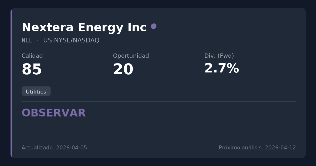 NextEra Energy opera como una empresa de doble modelo, que presenta una destacada empresa de servicios públicos de electricidad regulada en Florida junto con un negocio masivo de desarrollo de energía renovable no regulado. Para los inversores en dividendos, las Servicios Públicos (Utilities) reguladas suelen ofrecer flujos de caja estables y predecibles, aunque el modelo de NextEra combina esta estabilidad tradicional con proyectos de generación de alto crecimiento que requieren inversiones de capital extensas y continuas.