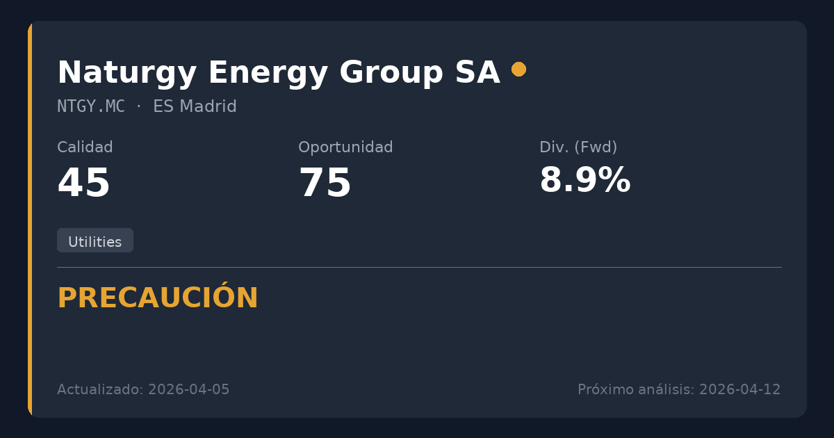 Naturgy opera una importante empresa regulada de Servicios Públicos (Utilities) de gas y electricidad con sólidos flujos de caja actuales y una valoración atractiva. Sin embargo, la transición estructural del gas tradicional a la energía renovable genera riesgo de ejecución, y un historial de cuatro recortes estratégicos de dividendo hace que el flujo de ingresos sea impredecible para estrategias conservadoras. No se recomienda para nuevas posiciones a pesar de la atractiva rentabilidad y la presión temporal en el precio por la venta institucional, ya que los riesgos de la transición estratégica a largo plazo superan la propuesta de valor actual.