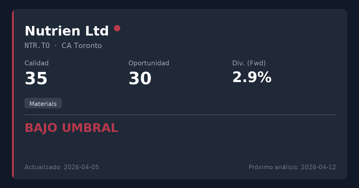 Nutrien es un líder agrícola global con una fuerte generación de flujo de caja y un balance sólido. Sin embargo, su modelo de negocio basado en materias primas en el sector cíclico de materiales lo convierte en un desajuste estructural para estrategias de dividendos conservadoras que buscan flujos de caja altamente predecibles. No recomendado para nuevas posiciones dados los múltiplos de valoración elevados y una baja rentabilidad por dividendo del 2,1% que no cumple con los requisitos mínimos de ingresos.