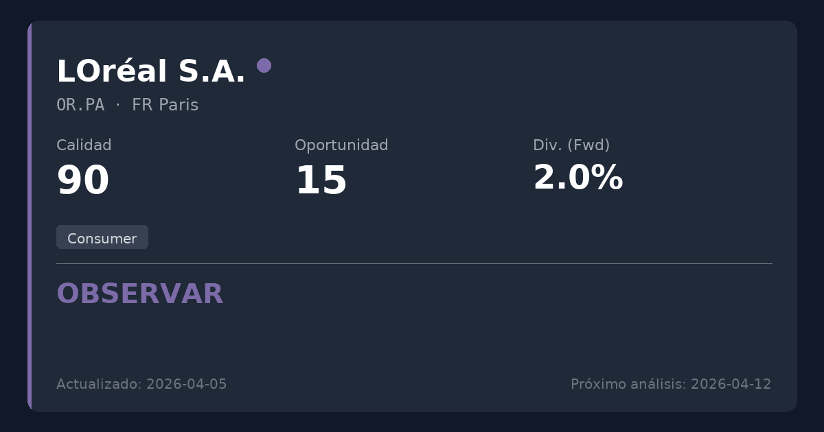 L'Oréal opera a nivel mundial en el sector de bienes de consumo, dominando específicamente la industria de la belleza y el cuidado personal a través de una cartera diversa de marcas de lujo, profesionales y de gran consumo. Aunque no es una empresa de Servicios Públicos (Utilities) regulada tradicional, su fuerte lealtad a la marca y la naturaleza esencial de las rutinas de cuidado personal proporcionan flujos de caja recurrentes y altamente fiables, similares a los de los bienes de consumo básico, aunque estos atributos suelen cotizar con una prima de mercado significativa.