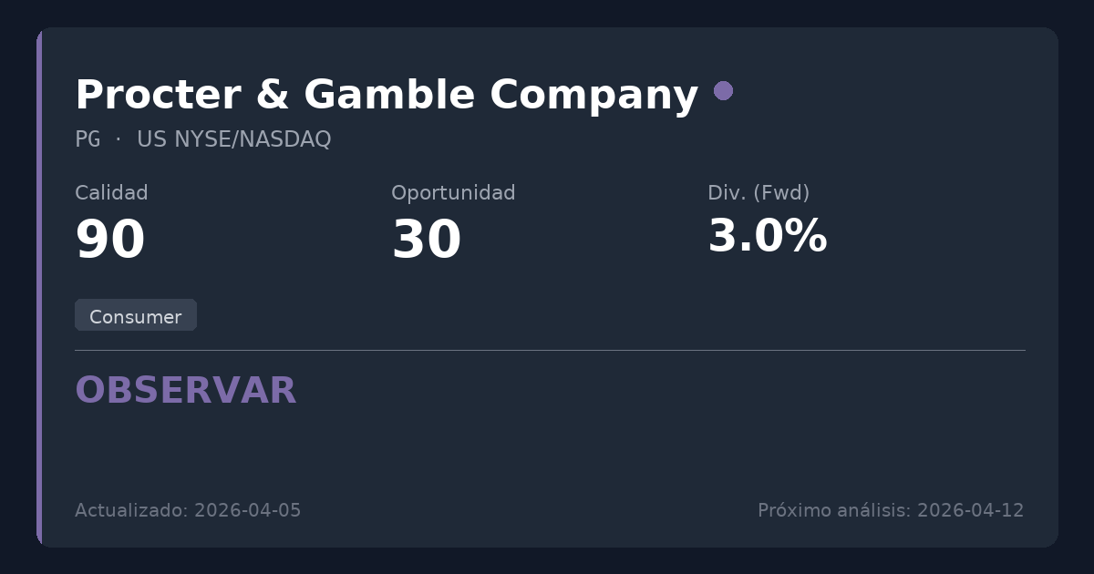 Procter & Gamble es un líder mundial de primer nivel en el sector de bienes de consumo básico, con una cartera inigualable de marcas esenciales de uso diario y un historial de dividendos muy seguro. Si bien la compañía cuenta con una estabilidad financiera excepcional y un payout seguro del 62%, los niveles de valoración actuales ofrecen un potencial de revalorización limitado. Los accionistas actuales deberían mantener sus posiciones dados sus sólidos fundamentales, pero los nuevos inversores quizá quieran esperar a un mejor punto de entrada que ofrezca una mayor rentabilidad por dividendo y un margen de seguridad.