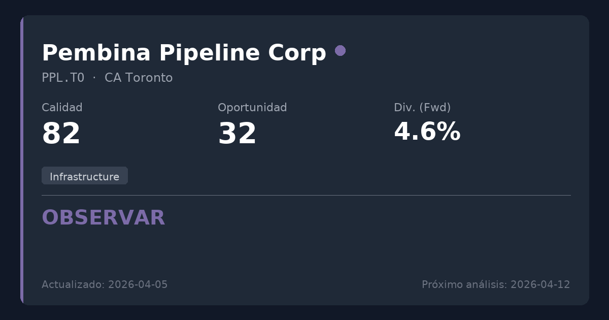 Pembina Pipeline es un proveedor de infraestructura energética de alta calidad con un fuerte foso competitivo y flujos de caja muy fiables. Mientras que los fundamentales del negocio son excepcionalmente sólidos y el dividendo del 4,67% está cubierto de forma segura por el flujo de caja libre, la valoración actual en torno a los 62 $ (PER de 21,3x) ofrece un potencial alcista limitado para nuevo capital. Los accionistas actuales deberían mantener sus posiciones para percibir los ingresos fiables, pero los nuevos inversores quizás quieran esperar un mejor punto de entrada.