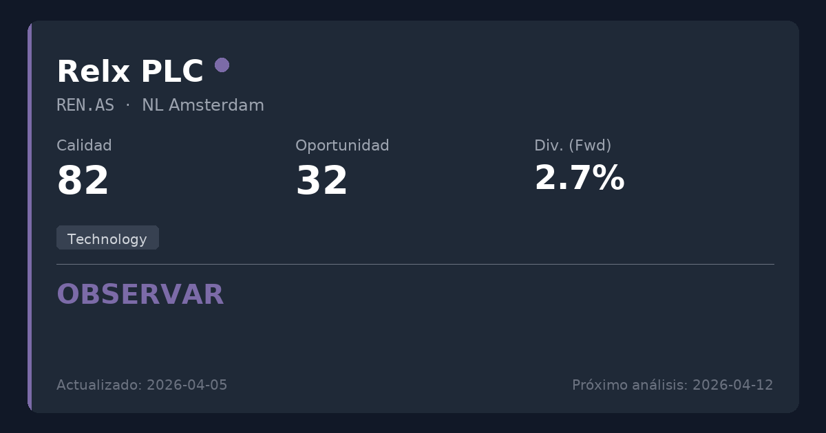 RELX opera como proveedor global de análisis basados en información y herramientas de decisión para clientes profesionales y empresariales, estructurada en los segmentos de riesgo, científico/médico, legal y exposiciones. Aunque categorizada en el sector de Tecnología —que los inversores conservadores en dividendos suelen evitar debido al riesgo de obsolescencia rápida—, RELX funciona más como un proveedor de servicios B2B esencial con profundas y monopolísticas barreras de entrada basadas en datos e ingresos por suscripción altamente recurrentes.
