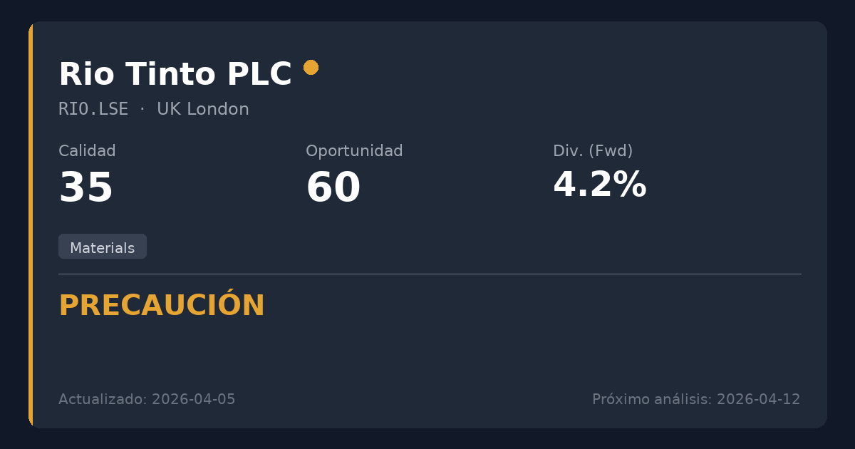 Si bien Rio Tinto es un gigante minero global de primer nivel con un balance impecable, su dependencia de los precios de materias primas altamente cíclicos lo hace inadecuado para estrategias de dividendo conservadoras que buscan ingresos predecibles. El historial de múltiples recortes de dividendo, incluyendo una reducción propuesta del 21,9% para 2026, refleja esta volatilidad inherente. No recomendado para nuevas posiciones a pesar de la atractiva valoración PER de 11,43, ya que el modelo de negocio fundamental crea un desajuste estratégico continuo.