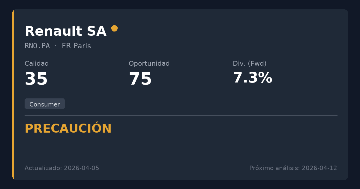 Si bien Renault ofrece una tentadora oportunidad de valor profundo, derivada de un ajuste contable no monetario de 9.300 millones de euros, la ciclicidad inherente del sector automovilístico lo hace inadecuado para estrategias conservadoras de dividendos. La valoración profundamente descontada (P/B 0.40) y el sólido efectivo neto automotriz reportado presentan un escenario interesante para inversores tolerantes al riesgo, pero la volatilidad histórica, el flujo de caja libre negativo y un recorte de dividendo propuesto justifican un enfoque muy cauteloso. No recomendado para nuevas posiciones centradas en dividendos que busquen ingresos fiables a largo plazo.