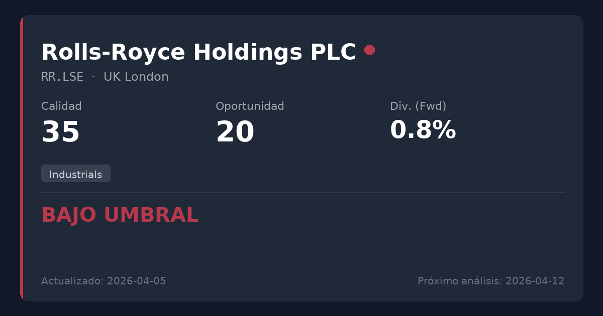 Rolls-Royce diseña, fabrica y presta servicios a sistemas de energía de misión crítica para los mercados aeroespacial civil, de defensa y de sistemas de energía. Aunque la empresa goza de fuertes barreras de entrada y contratos de servicio a largo plazo, la industria aeroespacial es altamente cíclica y vulnerable a los shocks geopolíticos, lo que la hace inherentemente difícil para generar los dividendos estables e ininterrumpidos preferidos por las estrategias de renta conservadoras.