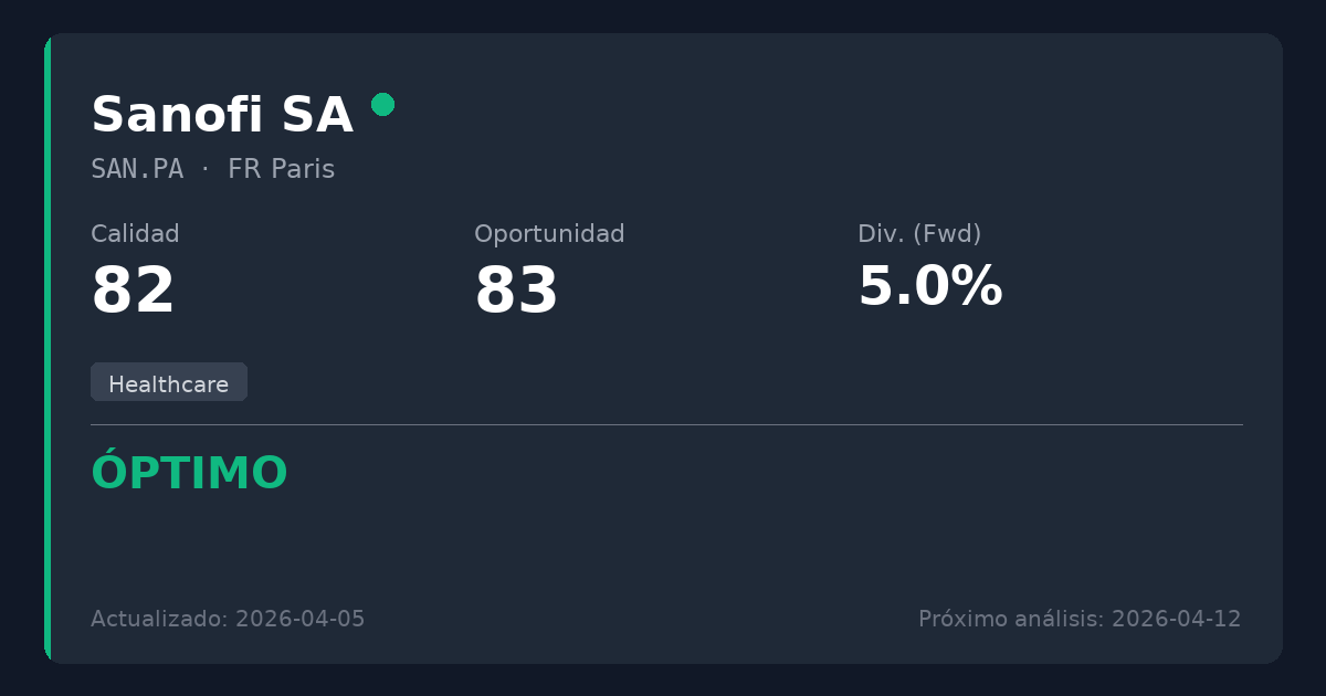 Sanofi es una empresa biofarmacéutica global líder que descubre, desarrolla y distribuye medicamentos y vacunas, centrándose en inmunología, enfermedades raras, oncología y neurología. En el contexto de la inversión en dividendos, los proveedores de atención sanitaria de gran capitalización ofrecen flujos de Ingresos muy defensivos y no cíclicos, ya que los tratamientos médicos son servicios esenciales, aunque los inversores deben monitorizar continuamente las expiraciones de patentes y los desarrollos de ensayos clínicos.