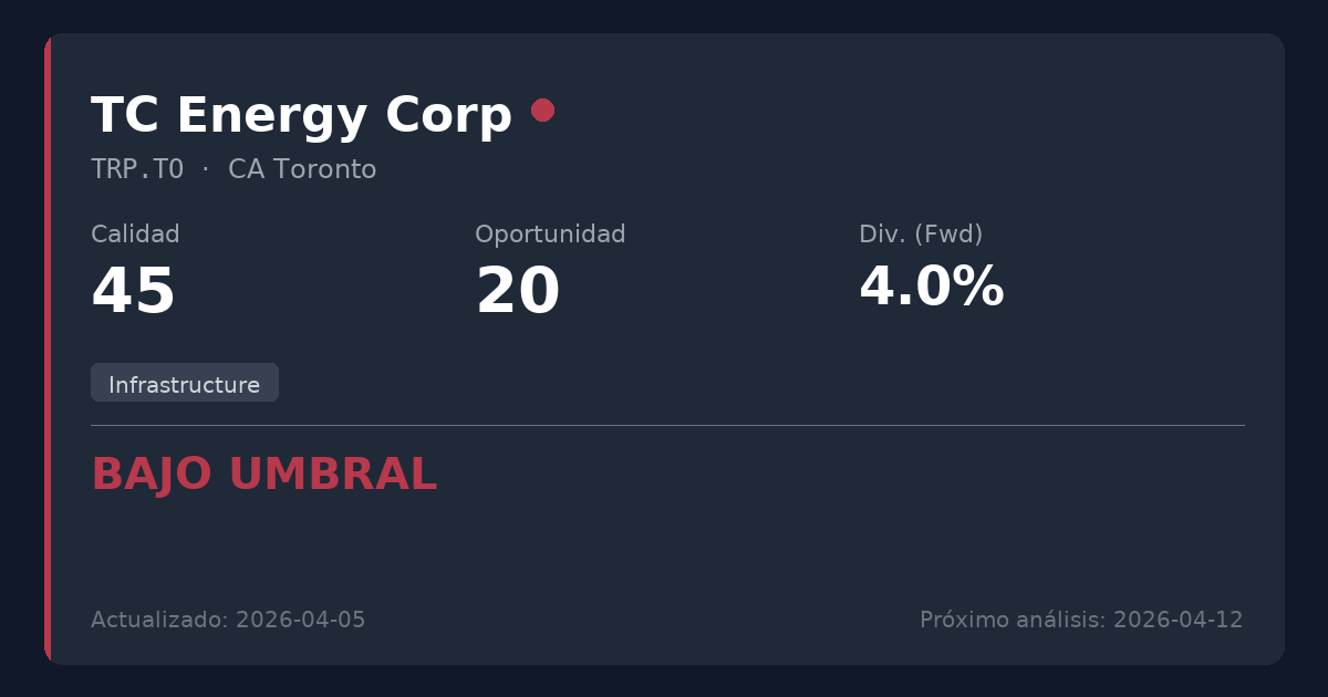 TC Energy es un importante proveedor norteamericano de infraestructura energética que opera redes de gasoductos esenciales con flujos de caja altamente contractualizados. Aunque la compañía posee activos monopolísticos de calidad y está transicionando hacia un modelo de Servicios Públicos (Utilities) de menor riesgo, su valoración actual estirada (PER 26) y su elevado perfil de deuda la hacen inadecuada para nuevas inversiones. Existen mejores oportunidades en empresas de infraestructura con una mayor cobertura de Flujo de Caja Libre y un apalancamiento más conservador.