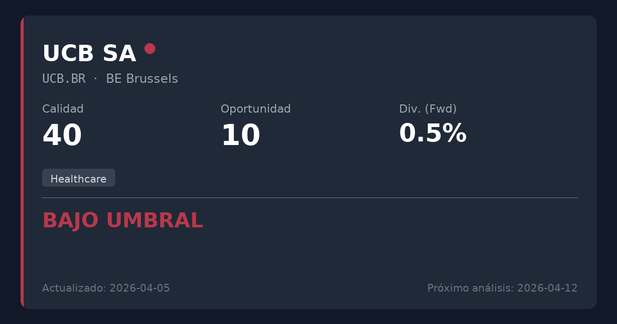 UCB SA es una empresa biofarmacéutica de alto rendimiento con un excelente impulso operativo y un balance impecable. Sin embargo, con un PER elevado que supera las 32x y una rentabilidad por dividendo insignificante del 0,54%, funciona estrictamente como una acción de crecimiento en lugar de una inversión de valor por dividendo. No se recomienda para nuevas posiciones, ya que sus características estructurales y su valoración son un completo desajuste para estrategias de ingresos conservadoras.
