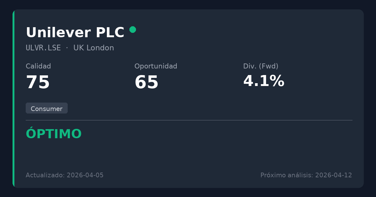 Unilever es un gigante global dominante de productos de consumo básico que está experimentando una transformación estratégica masiva para convertirse en un negocio puro de belleza y cuidado personal con mayores márgenes. La reciente liquidación del mercado, impulsada por la incertidumbre sobre el complejo acuerdo de $45 mil millones con McCormick foods y un ajuste proporcional del dividendo del 13,6% tras estas escisiones, crea una oportunidad temporal atractiva. Cotizando a 4.172 GBX, dentro de nuestro rango de valor razonable de 4.090-4.908 GBX, este es un punto de entrada atractivo para inversores en dividendos que buscan flujos de caja defensivos, ya que el dividendo se mantiene altamente seguro con una cobertura del 56% de Flujo de Caja Libre.