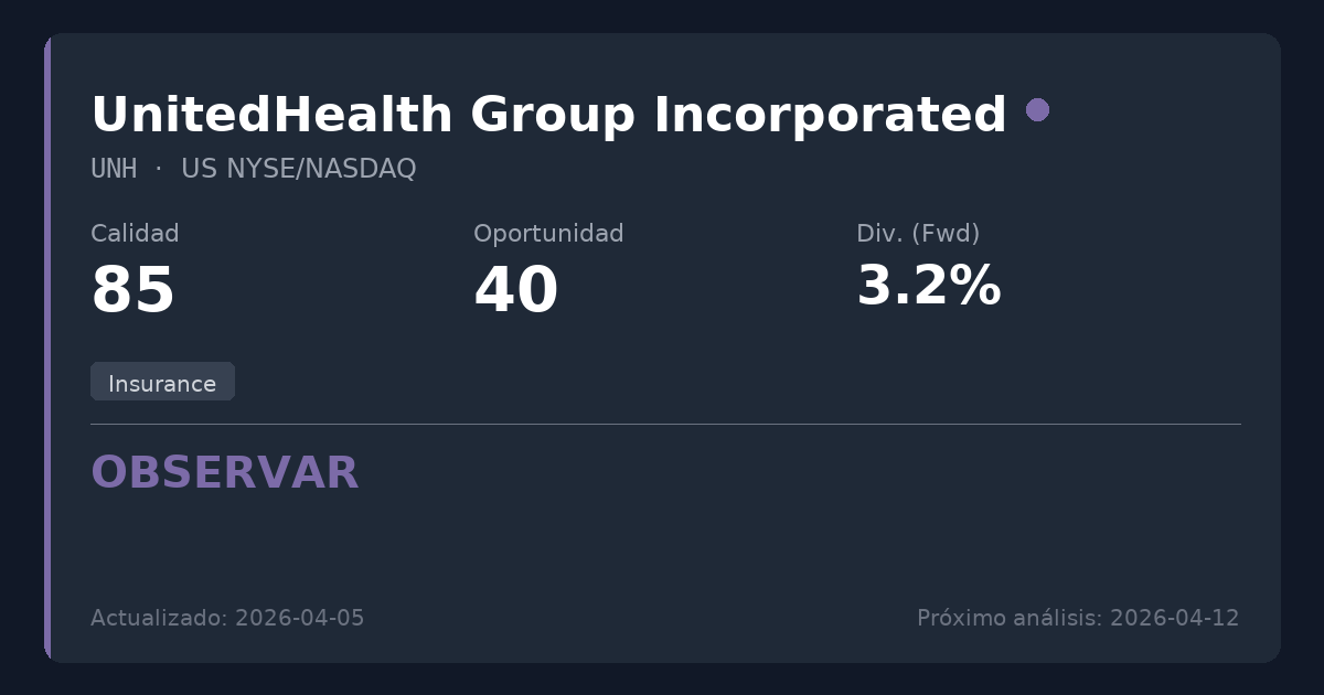 UnitedHealth Group es un conglomerado diversificado de atención médica y seguros que genera ingresos a través de prestaciones de salud (UnitedHealthcare) y servicios de salud (Optum). En el contexto de una estrategia de dividendos, el seguro de salud actúa como un servicio esencial altamente defensivo con flujos de caja recurrentes y predecibles por primas, aunque el escrutinio regulatorio y las tendencias de los costes médicos requieren un seguimiento continuo.