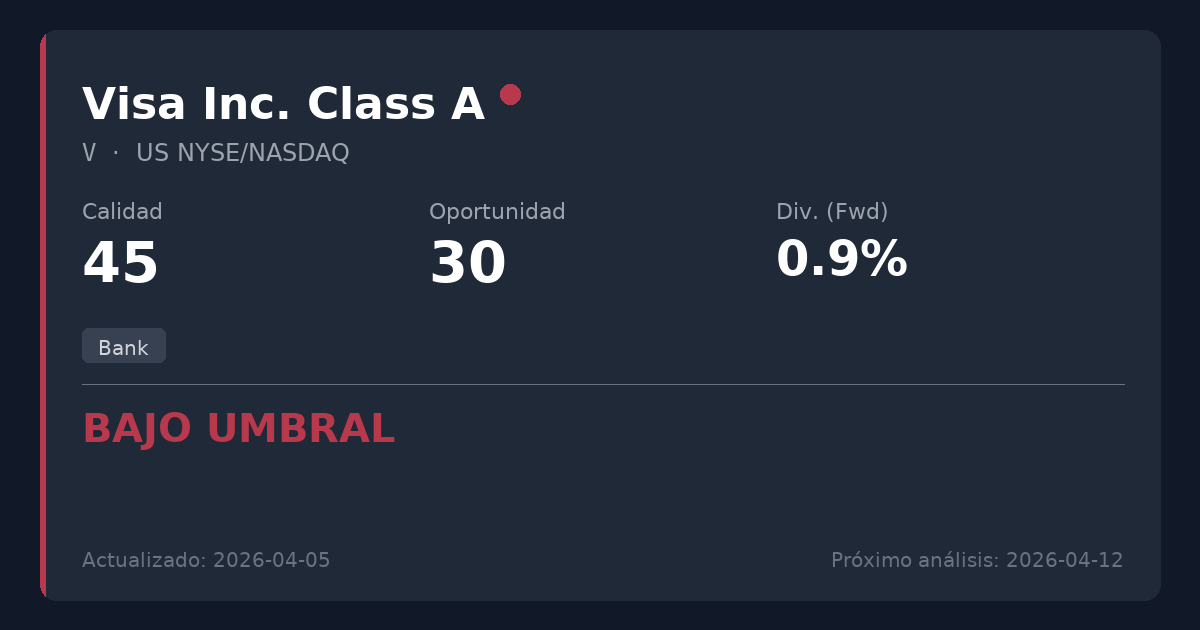 Visa opera una red de pagos global inigualable con márgenes excepcionales, un balance impecable y una ventaja competitiva dominante. Sin embargo, con una rentabilidad por dividendo insignificante del 0,84% y un PER de 28,2x estirado, representa un completo desajuste estratégico para los inversores de valor por dividendo. No recomendada para nuevas posiciones, ya que la acción ofrece ingresos corrientes insuficientes y cotiza muy por encima de los umbrales de valor a pesar de las recientes caídas del mercado.