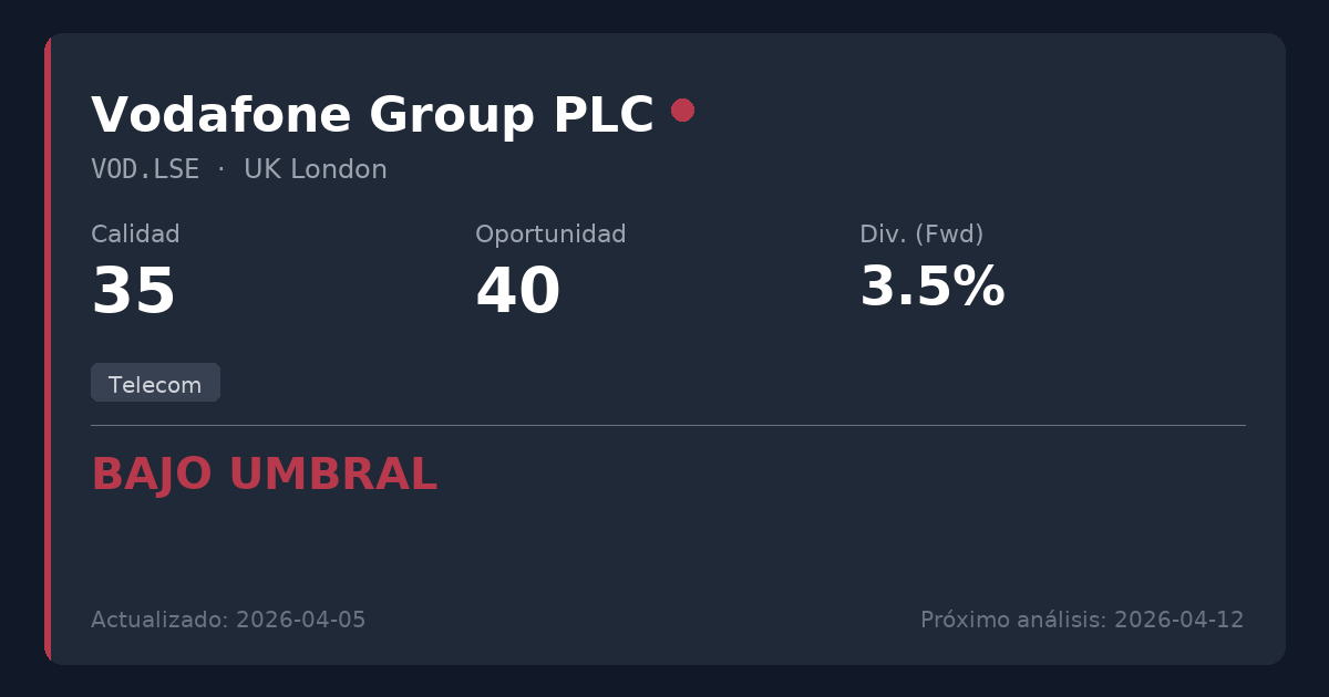 Vodafone es un importante proveedor global de telecomunicaciones que opera en un sector de servicios esenciales. Sin embargo, una trayectoria de una década de ingresos decrecientes, pérdidas netas estructurales recurrentes y un historial de recortes de dividendos en serie, hacen que la empresa no sea adecuada para estrategias de dividendos conservadoras. No recomendada para nuevas posiciones, ya que el inminente recorte de dividendo del 41,5% y el deterioro fundamental a largo plazo superan con creces cualquier valor aparente en el precio actual de la acción.