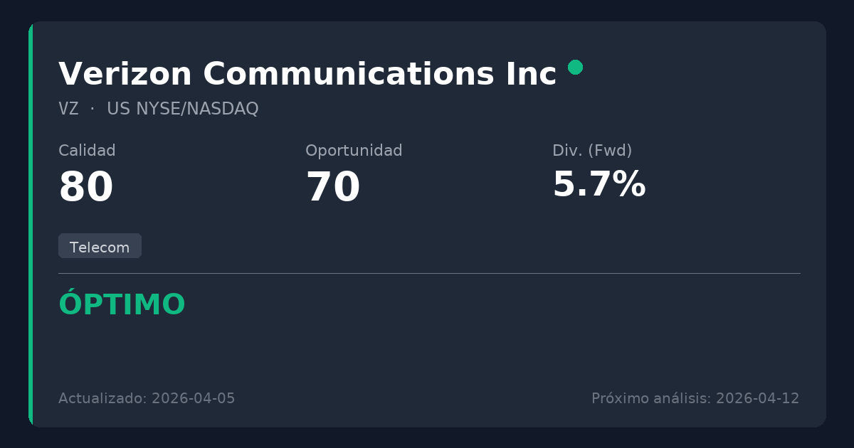 Verizon es un proveedor dominante de telecomunicaciones en EE. UU., que suministra infraestructura esencial de redes inalámbricas y de banda ancha a consumidores y empresas. El sector de las telecomunicaciones es altamente intensivo en capital, haciendo que niveles de deuda más elevados, como 3,8x Deuda Neta/EBITDA, sean normales, mientras que la naturaleza oligopolística de la industria asegura flujos de caja por suscripción altamente predecibles y similares a los de Servicios Públicos (Utilities).