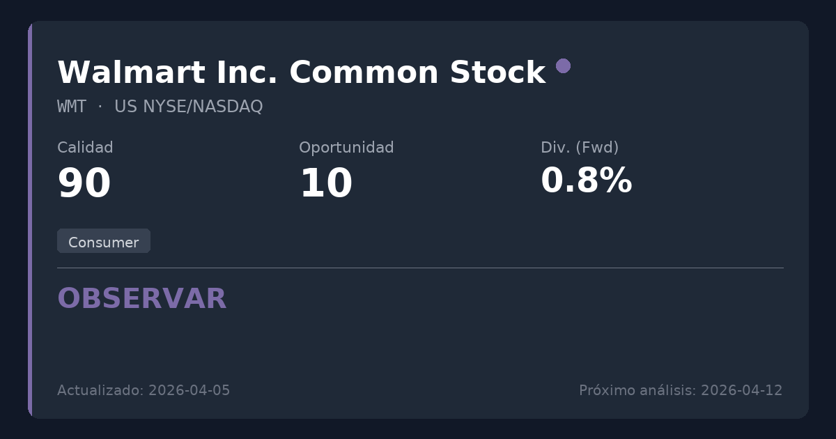 Walmart es un líder minorista global indiscutible que opera un negocio de consumo esencial y altamente resistente con una estabilidad financiera impecable. Si bien la calidad del negocio subyacente sigue siendo excepcional y actúa como refugio seguro durante la actual volatilidad macroeconómica, la valoración altamente elevada ofrece un potencial alcista limitado. Los accionistas existentes deberían mantener sus posiciones dada la fortaleza defensiva de la compañía, pero los nuevos inversores deberían esperar un punto de entrada más atractivo.