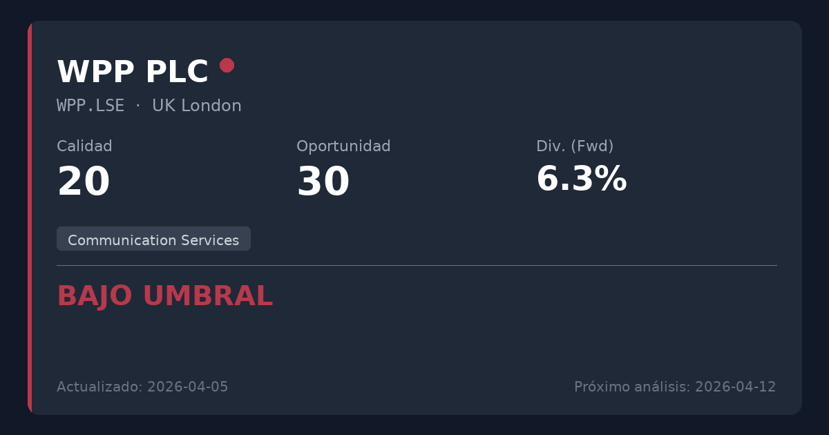 WPP PLC es una agencia de publicidad global que opera en un sector altamente cíclico y no esencial. La empresa se enfrenta a graves desafíos estructurales, evidenciados por un descenso de los beneficios a largo plazo, importantes pérdidas de clientes, un apalancamiento elevado y una inminente propuesta de recorte de dividendo del 61,3%. Dados los fundamentales en deterioro y la clara falta de alineación estratégica, esta acción representa una trampa de valor y debería ser evitada por inversores de dividendo conservadores.
